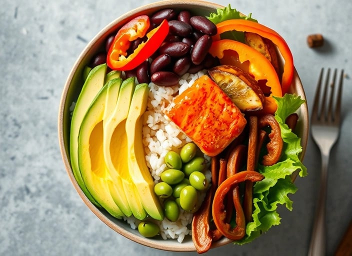 Eine ausgewogene Bowl lässt sich gut über die Verteilung der Makronährstoffe strukturieren. Als Orientierung kann folgende Aufteilung dienen: Etwa 40–50 % der Bowl bestehen bezogen auf die Kalorien aus Gemüse, 20–30 % aus komplexen Kohlenhydraten, 20–30 % aus einer Eiweißquelle und 10–20 % aus gesunden Fetten, die meist über Toppings oder das Dressing ergänzt werden. Um das Ganze greifbar und alltagstauglich zu gestalten, hilft der "gesunde" Teller: